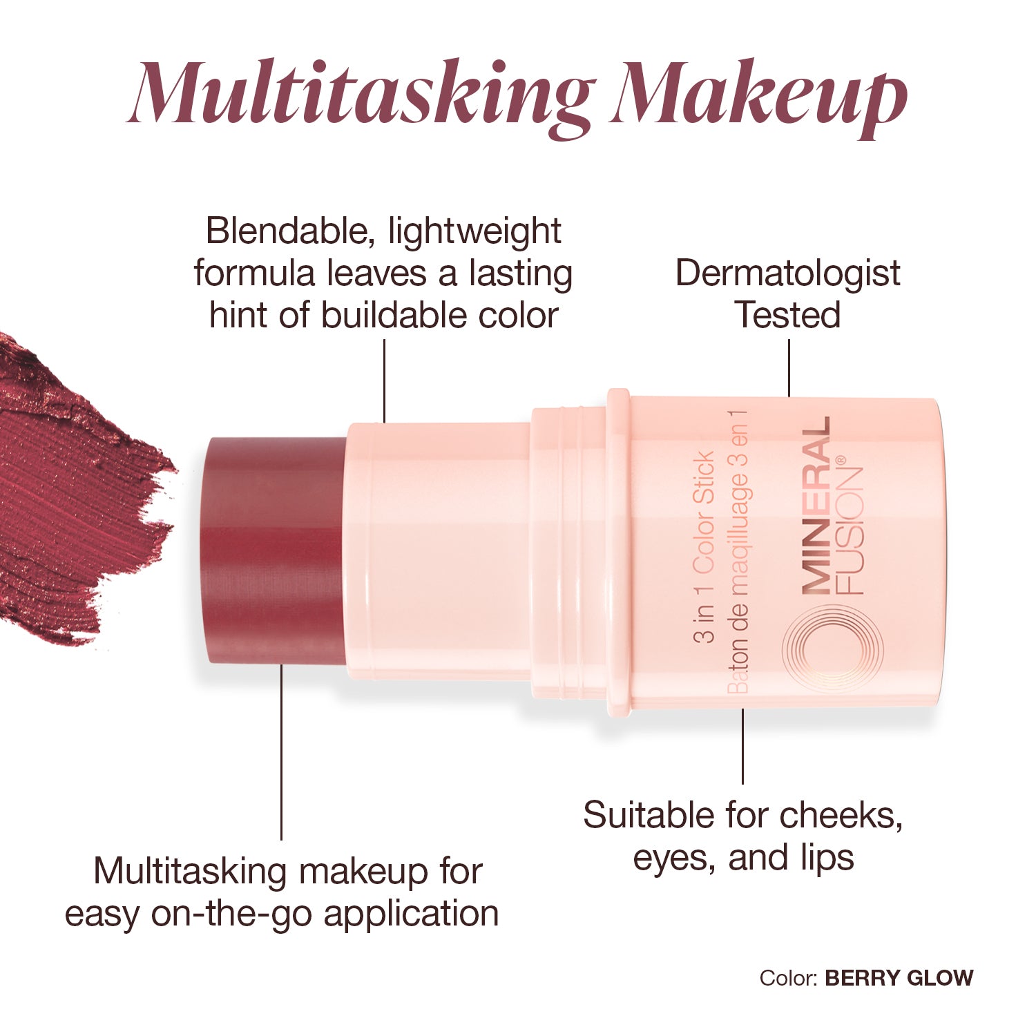 The all-in-one color go-to. Mineral Fusion 3-in-1 Color Stick is a lip tint, cheek tint, and eyelid color pop in one super easy twist tube to streamline your makeup routine. Just pat on with fingertips throughout the day for a subtle shimmer and glow.
